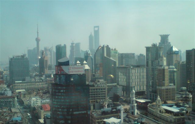 Jag bifogar en bild på utsikten från mitt kontorsfönster, i mitten ser ni ”Ölöppnaren Shanghais högsta kåk drygt 500 m hög, och en bild från Nanjing Road